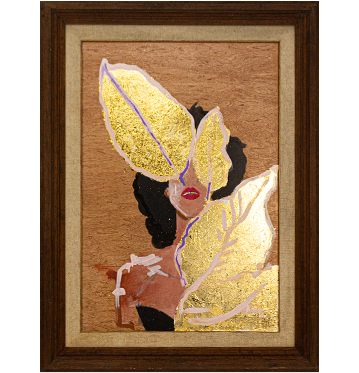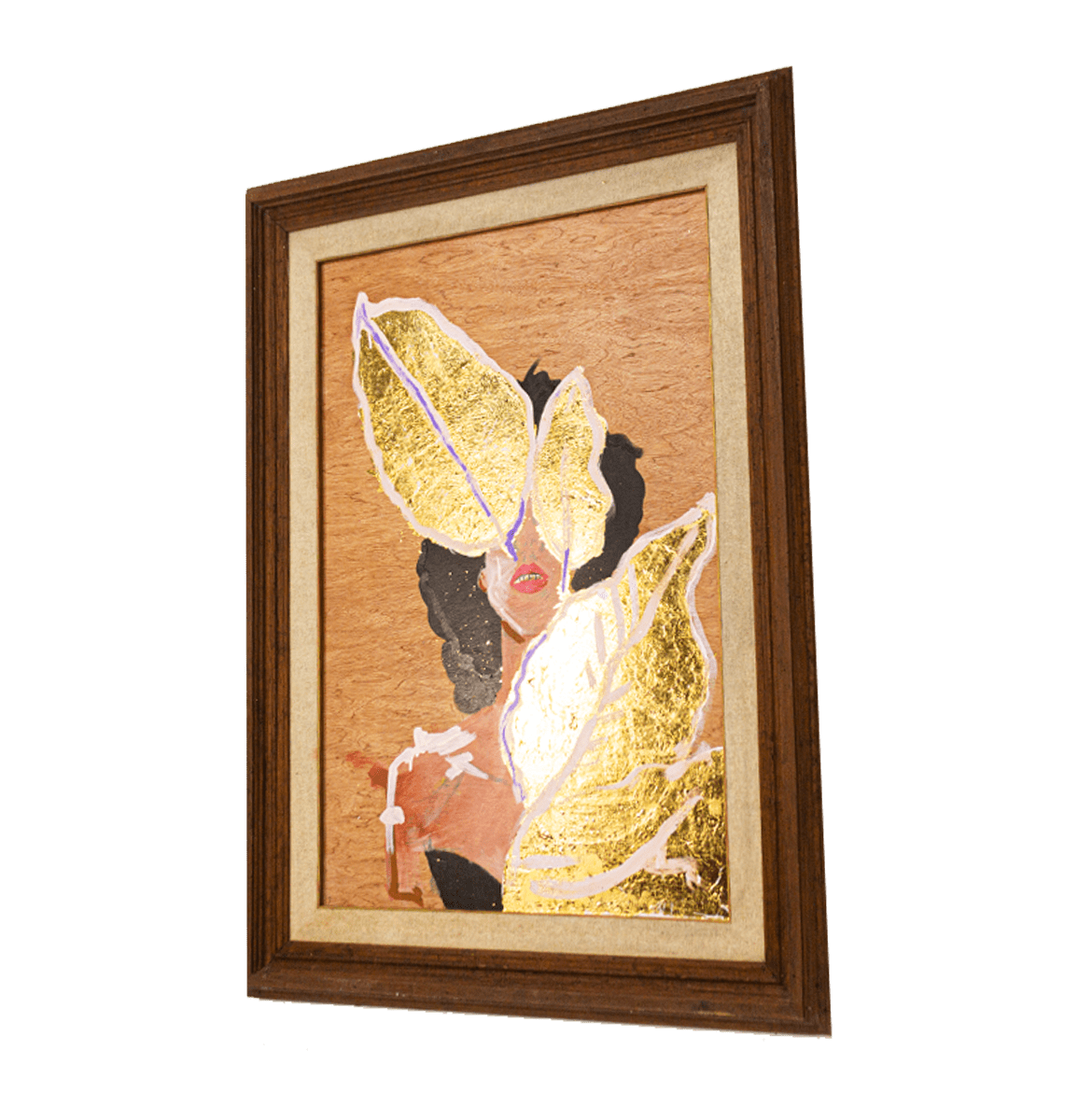 A beautiful fusion of nature and elegance, “Naturaleza de Oro” features a woman smiling softly, her eyes hidden behind golden leaves that seem to grow organically from the canvas. The leaves not only conceal her gaze but also subtly frame her form, with gold-accented paper extending to cover part of her torso and left arm, creating a mystical and serene presence.