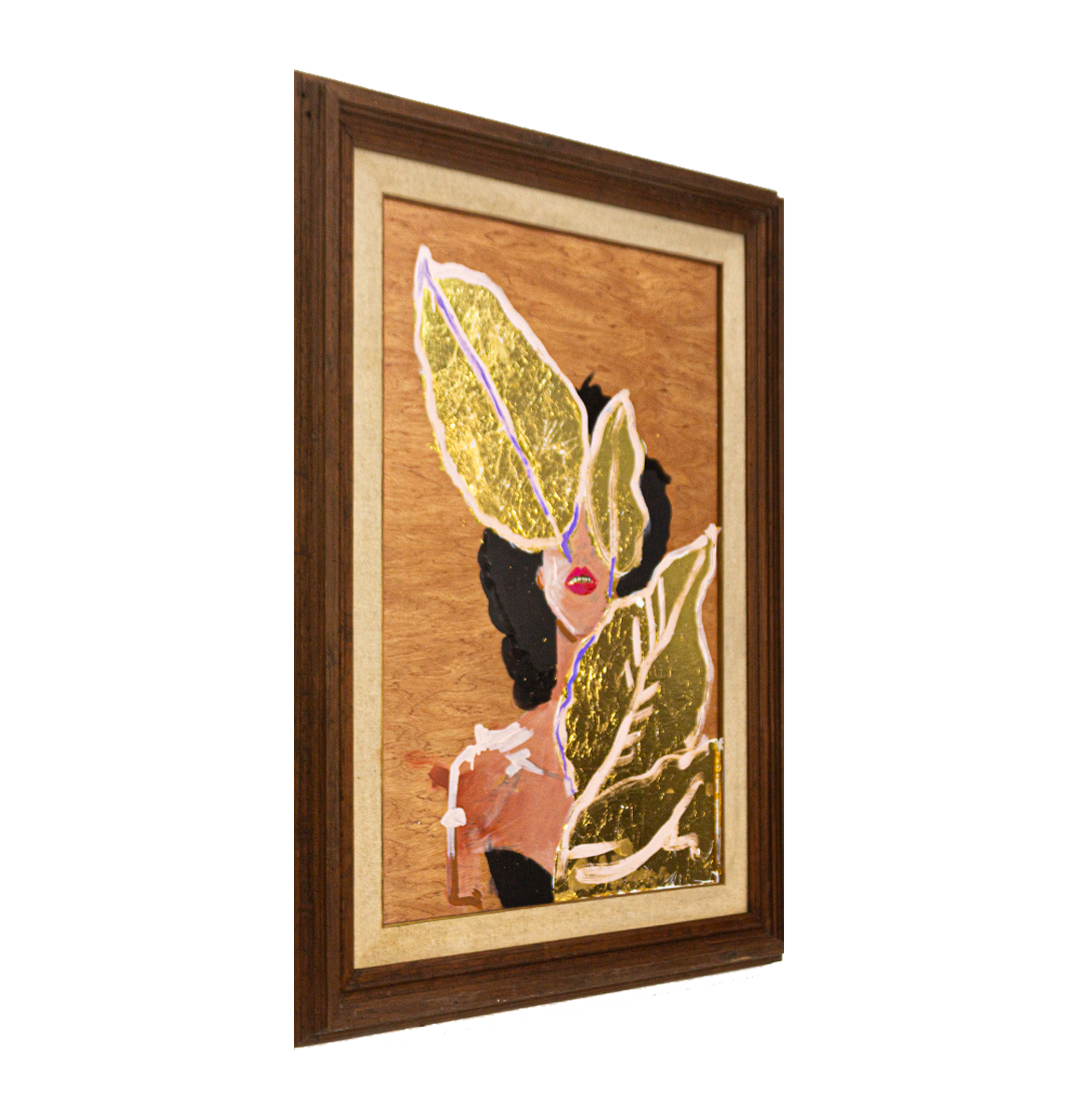 Acrylic painting of a woman with golden leaves covering her eyes and torso, framed in vintage wood. A nature-inspired, elegant portrait with gold leaf details.